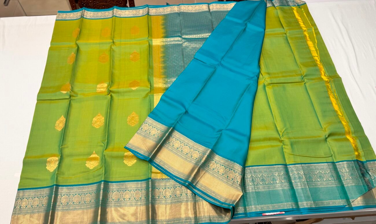Royal touch Kanchipuram silk saree with contrast border and small buttas with big border on one side and small border on the other side