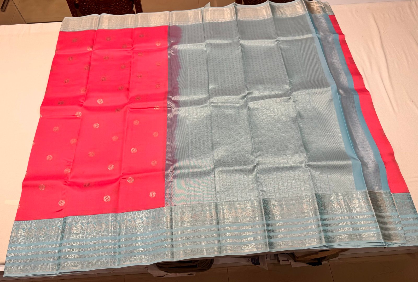 • Saree Color – Peachish Pink & Sky Blue