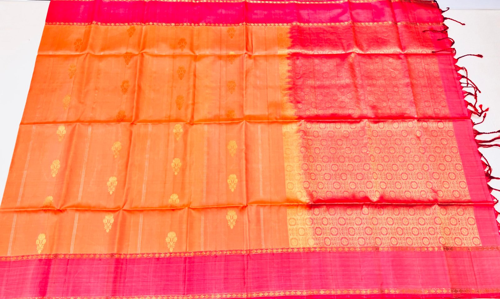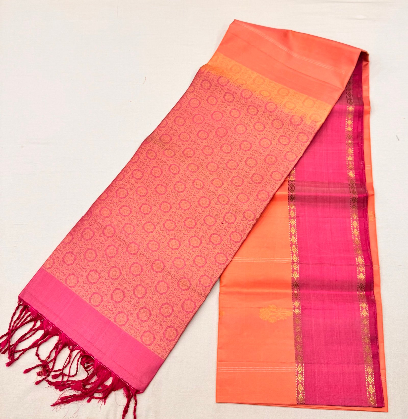 Pure Kanchipuram Soft Silk Sarees are a true symbol of South Indian heritage. Handwoven using premium quality pure silk and rich zari, these sarees feature elegant borders, intricate motifs, and a beautifully crafted pallu.